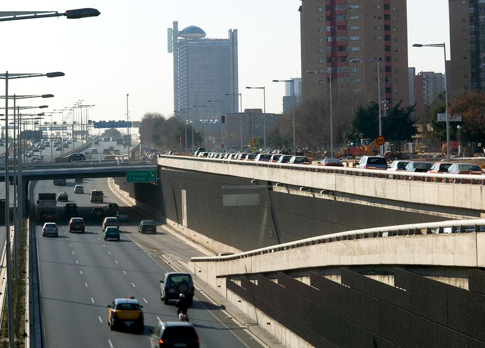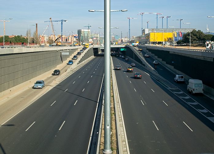 - Se prevén unas calzadas laterales con 3 carriles de circulación de 3 m de ancho cada uno. Cada una de estas calzadas laterales dispone de sentido único de circulación, sentido Llobregat la calzada lateral montaña, y en sentido Plaza Cerdà la calzada lateral mar.