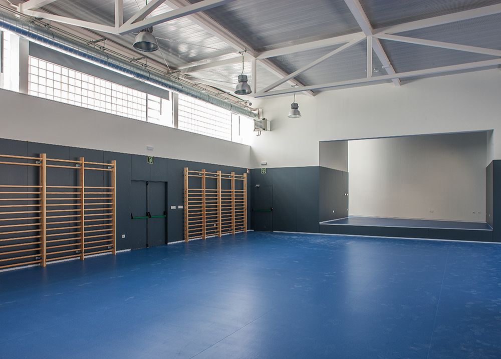 El nuevo edificio se dispone mediante dos piezas separadas por un porche. La primera pieza, correspondiente al programa docente, se explicita como una continuidad de la escuela existente, la otra pieza, correspondiente al gimnasio, se dispone perpendicular al volumen docente.