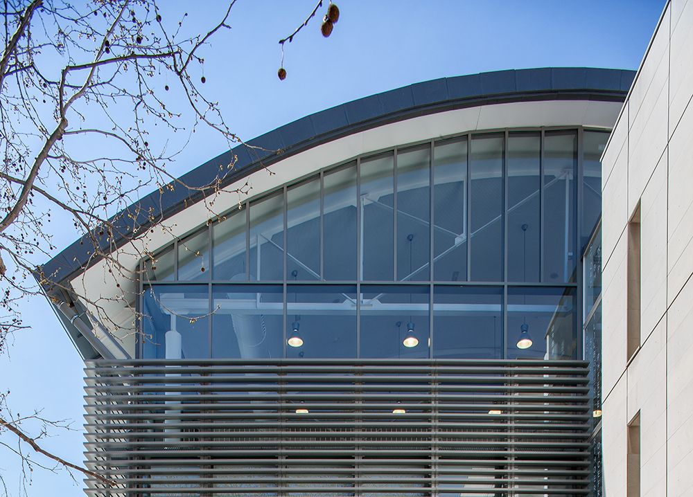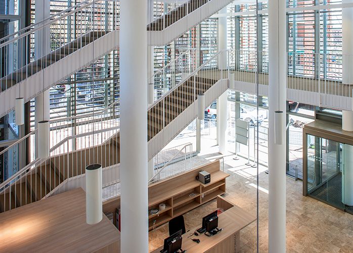 Como consecuencia del cambio de situación del ascensor, se cierra el agujero del existente con una chapa colaborante y se realiza uno nuevo a base de muros de hormigón que se prolongan hasta la planta sótano -1, planta en que se cambia el tipo de estructura por una metálica arriostrada con tubos estructurales de 140 y HEB 140 en uno de los extremos, dado que tiene que recoger las cargas adicionales que recibe de aguantar parte de la pasadera de unión entre edificios. De la planta sótano -1 sale la nueva escalera que conecta todo el edificio verticalmente, construida con estructura metálica. Las fachadas actuales están formadas por un chapado de piedra con toques de mortero y atornilladas con tornillos galvanizados. La actuación que se lleva a cabo sobre la misma consiste en cerrar algunos entrepaños que actualmente son de vidrio por otros macizos con el mismo acabado pétreo. El edificio actual presenta una gran superficie acristalada de muro cortina con unos vidrios sin cámara y sin protección solar. Lo que se ha decidido es cambiar el muro cortina existente por uno nuevo que pueda aguantar el peso de los nuevos vidrios, así como la estructura suplementaria colocada para sujetar el piso metálico que permita su limpieza y el brise-soleil, que reduce la aportación calórica en el interior del edificio.