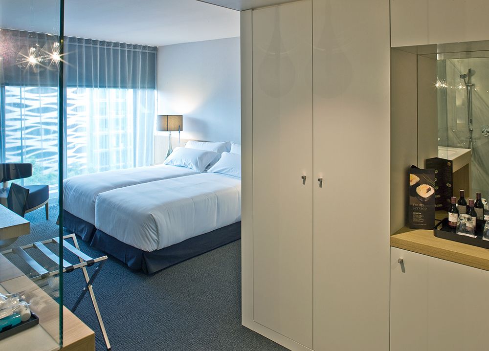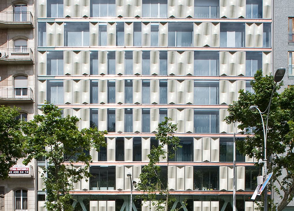 La arquitectura pretende ofrecer al que será nuevo hotel en Paseo de Gracia 84, un aire de oficinas que mantenga o retenga en la memoria lo que históricamente este antiguo y valioso edificio significó para la ciudad de Barcelona. Para ello, da unos acabados de sendos aceros inoxidables en exterior de pasillos y carpinterías metálicas exteriores entre inox y similar con vidrios, y distintos en interior de las habitaciones, para las que todo pasa por obtener el mejor aislamiento y confort acústicos posibles con paneles que incorporan un coeficiente alfa de fono absorbencia.