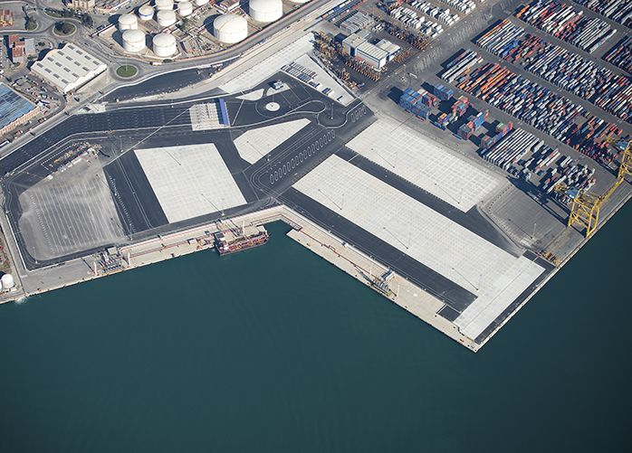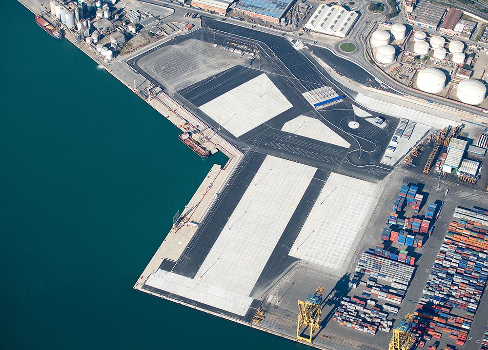 Explanada de 20 ha, de terreno ganado al mar, para la operación logística de almacenamiento de contenedores en una terminal portuaria (la Terminal de Contenedores de TCB en el Muelle Sur del Puerto de Barcelona). En los terrenos ya consolidados se construyen los servicios, pavimentos y edificios para dejar totalmente operativa la plataforma. Compatibles con la terminal existente de ferrocarriles (de doble ancho) y con la plataforma de almacenamiento actualmente en uso. La obra se puede segregar en tres tipos de actuaciones: